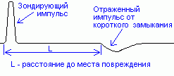 Рис 2.2 Рефлектограмма В левой части рисунка показана кабельная линия с муфтой и коротким замыканием, а в нижней части – рефлектограмма этой кабельной линии. Анализируя рефлектограмму линии, оператор получает информацию о наличии или отсутствии в ней повреждений и неоднородностей. Например, по приведенной выше рефлектограмме можно сделать несколько выводов. 1. На рефлектограмме кроме зондирующего импульса есть только два отражения: отражение от муфты и отражение от короткого замыкания. Это свидетельствует о хорошей однородности линии от начала до муфты и от муфты до короткого замыкания. 2. Выходное сопротивление рефлектометра согласовано с волновым сопротивлением линии, так как переотраженные сигналы, которые при отсутствии согласования располагаются на двойном расстоянии, отсутствуют. 3. Повреждение имеет вид короткого замыкания, так как отраженный от него сигнал изменил полярность. 4. Короткое замыкание полное, так как после отражения от него других отражений нет. 5. Линия имеет большое затухание, так как амплитуда отражения от короткого замыкания много меньше, чем амплитуда зондирующего сигнала. Если выходное сопротивление рефлектометра не согласовано с волновым сопротивлением линии, то в моменты времени 2∙tм, 4∙tм и т.д. будут наблюдаться переотраженные сигналы от муфты, убывающие по амплитуде, а в моменты времени 2∙tх, 4∙tх и т.д. – переотражения от места короткого замыкания. Основную сложность и трудоемкость при методе отраженных импульсов представляет выделение отражения от места повреждения на фоне помех. Метод импульсной рефлектометрии базируется на физическом свойстве бесконечно длинной однородной линии, согласно которому отношение между напряжением и током введенной в линию электромагнитной волны одинаково в любой точке линии. Это соотношение: W = U/I (2.1) имеет размерность сопротивления и называется волновым сопротивлением линии. При использовании метода импульсной рефлектометрии в линию посылают зондирующий импульс и измеряют интервал tх – время двойного пробега этого импульса до места повреждения (неоднородности волнового сопротивления). Расстояние до места повреждения рассчитывают по выражению: Lx = tx∙V/2, (2.2) где V – скорость распространения импульса в линии. Отношение амплитуды отраженного импульса Uо к амплитуде зондирующего импульса Uз обозначают коэффициентом отражения Котр: Котр = Uo/Uз = (W1 – W) / (W1 + W), (2.3) где: W – волновое сопротивление линии до места повреждения (неоднородности), W1 – волновое сопротивление линии в месте повреждения (неоднородности). Отраженный сигнал появляется в тех местах линии, где волновое сопротивление отклоняется от своего среднего значения: у муфт, у мест изменения сечения жилы, у мест сжатия кабеля, у места обрыва, короткого замыкания и т.д. Если выходное сопротивление импульсного рефлектометра отличается от волнового сопротивления измеряемой линии, то в месте подключения рефлектометра к линии возникают переотражения. Переотражения – это отражения от входного сопротивления рефлектометра отраженных сигналов, которые пришли к месту подключения рефлектометра из линии. Выходное и входное сопротивления рефлектометра, как правило, равны между собой. В зависимости от соотношения входного сопротивления рефлектометра и волнового сопротивления линии изменяется полярнос