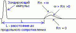 Рис 2.6 Отражение импульса от различных мест повреждения В идеальном случае, когда отражение от повреждения полное и затухание отсутствует, амплитуда отраженного сигнала равна амплитуде зондирующего импульса. Рассмотрим два случая эквивалентных схем повреждений, которые наиболее часто встречаются на практике: шунтирующая утечка и продольное сопротивление. Пусть место повреждения линии представляет собой шунтирующую утечку Rш: