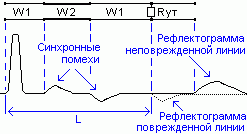 Рис 2.17 При дифференциальном анализе рефлектограммы поврежденной и неповрежденной линий Из рисунка видно, что при вычитании все синхронные помехи компенсируются. По разностной рефлектограмме легко обнаружить отражение от места повреждения и определить расстояние L до него. Наилучшие результатов от сравнения и вычитания удается получить при использовании в качестве исправной линии жилы или кабельной пары того же кабеля. При измерении кабельной линии методом импульсной рефлектометрии асинхронные и синхронные помехи присутствуют на рефлектограмме одновременно. Асинхронные помехи (кроме помех импульсного характера), как правило, имеют одинаковые величины, независимо от того, с какого конца кабельной линии ведется измерение рефлектометром. Синхронные помехи при измерении с разных концов кабеля имеют различную величину, в зависимости от многих факторов: длины кабельной линии, затухания импульсных сигналов, удаленности места повреждения и мест неоднородностей волнового сопротивления кабельной линии, точности согласования выходного сопротивления импульсного рефлектометра с волновым сопротивлением линии и других факторов. Поэтому отраженный сигнал от одной и той же неоднородности может иметь различные величины при измерении с разных концов линии. Если хотя бы предположительно известно, к какому концу кабельной линии ближе может быть расположено место повреждения, то для измерений нужно выбирать именно этот конец кабельной линии. В других случаях желательно проводить измерения последовательно с двух концов кабельной линии. Следует учитывать, что даже такие повреждения как «короткое замыкание» и «обрыв», дающие максимальные отражения зондирующего сигнала, не всегда можно легко обнаружить на фоне помех. Например при большом затухании и больших неоднородностях волнового сопротивления линии амплитуда отражения от удаленного повреждений типа «короткое замыкание» или «обрыв» зачастую бывает меньше, чем отражения от близко расположенных неоднородностей волнового сопротивления. Поэтому такие повреждения являются сложным для обнаружения.