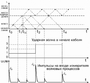 Рис 2.24 Волновой процесс при методе бегущей волны тока Ударная волна посылается в поврежденный кабель в момент t0 и в момент t1 достигает места повреждения. Под воздействием ударной волны происходит пробой поврежденного участка кабельной линии в момент t1з, вызывающий отражение. Этот отраженный сигнал возвращается к началу кабеля в момент t2 и отражается от начала кабеля (входное сопротивление генератора импульсов эквивалентно короткому замыканию) в сторону повреждения и в момент t4 снова достигает начала кабеля и т.д. Состояние пробоя (длительность электрической дуги) сохраняется до тех пор, пока достаточно энергии для горения дуги. Для того чтобы вызвать пробой в месте повреждения, необходимо в течение определенного времени (t1з – t1) воздействовать на поврежденный участок (время ионизации). Это время зависит от амплитуды высоковольтного импульса и переходного сопротивления в месте повреждения. Чтобы исключить влияние задержки ионизации на результат измерения расстояния до места повреждения, замеряют время между первой и второй отраженными волнами t2 и t4: Tl = t4 – t2. Связь измерителя волновых процессов с кабельной линией производится с помощью специального присоединительного устройства по току (импульсного токопреобразователя). Импульсный токопреобразователь дифференцирует импульсный ток на входе линии и преобразует его в однополярные импульсы, поступающие на вход измерителя волновых процессов. При волновом методе измерений выходное сопротивление высоковольтного источника не равно волновому сопротивлению линии, поэтому кроме отраженных волн от участка повреждения появляются отраженные от неоднородностей кабеля (муфт, ответвлений) и переотраженные от начала кабеля импульсные сигналы – синхронные помехи, значительно затрудняющие оценку импульсной характеристики кабеля. При волновом методе расстояние до места повреждения определяется по временной задержке между приходом к началу кабеля импульсов напряжения или импульсов тока, отраженных от места повреждения. Импульсы напряжения по длительности занимают половину расстояния до места повреждения, а ударные импульсы тока также имеют достаточно большие длительности. Это приводит к следующим недостаткам по сравнению с методом импульсной рефлектометрии: 1. Сложность анализа полученных импульсных характеристик при измерениях волновым методом. (Вид этих характеристик зависит не только от характера повреждения и длины линии, но и от величины поданных импульсов, наличия или отсутствия пробоя в месте повреждения и т.д.) 2. Низкая разрешающая способность, то есть невозможность обнаруживать близко расположенные неоднородности. (Отражения от неоднородностей вообще трудно различимы на импульсной характеристике кабельной линии, а отражения от соседних неоднородностей вообще сливаются друг с другом) 3. По импульсной характеристике невозможно получить ориентировки, расстояние до которых известно (в виде отражений от муфт, кабельных вставок и т.д.) 4. Большая погрешность измерения. (Это обусловлено относительно большими длительностями фронтов и срезов волновых процессов, которые формируются самой линией и процессом пробоя) 5. Невозможность стабильного повторения волновых процессов, что может привести к появлению ошибок. (Процесс пробоя является очень нестабильным, 