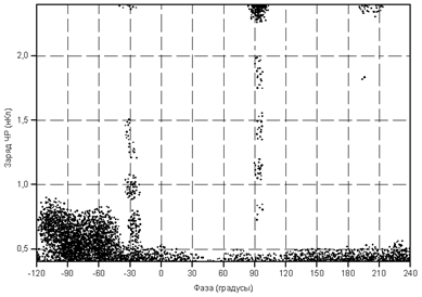 Рис 2.25 Точечная амплитудно-фазовая диаграмма Сравним этот способ запоминания и представления данных с таблицей, о которой говорилось выше. Если с точки зрения хранения данных не произошло каких-либо изменений (наш график с точки зрения компьютера это та же таблица), то форма представления данных стала гораздо удобнее (по крайней мере, на наш взгляд). Самое главное это то, что, получив возможность «одним взглядом» оценить сразу все полученные данные, мы не потеряли никакой информации. Каждый импульс зарегистрирован и может быть рассмотрен. По такой АФД мы можем определить все важнейшие характеристики сигналов ЧР, такие как фазовые распределения сигналов в заданном интервале амплитуд, амплитудные распределения импульсов в любом фазовом интервале, зависимость интенсивности сигналов от амплитуды (заряда) и т.д. Стандартная форма АФД Сразу же отметим, что точечное представление данных на АФД практически не используется. Во-первых, в таком виде ей неудобно пользоваться т. к. близко лежащие точки сливаются и становятся неразличимы. Кроме того, для определения числа импульсов, поступивших в интересующую нас зону (фазовый и амплитудный интервалы) приходится считать отдельные точки. Второй (и основной) причиной является то, что такой метод регистрации сигналов ЧР (измерение амплитуды и фазы каждого импульса ЧР) является неэкономичным, т. к. для запоминания параметров каждого из зарегистрированных импульсов требуемся много памяти и места на дисковом накопителе. Т.е. неудобен сам способ запоминания и хранения данных.