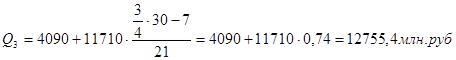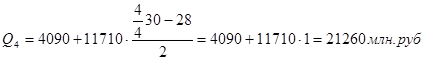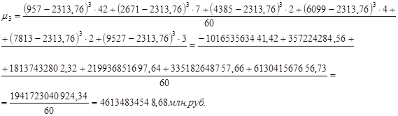 Для таблицы 3.2 рассчитаем квартили. Первый квартиль находится в интервале 121 – 1814, накопленная частота которого равна 42 млн.руб. Второй квартиль также находится в интервале 121 – 1814. Третий квартиль лежит в интервале 1814 – 3528 с накопленной частотой 49 млн.руб. Четвертый квартиль находится в интервале 10384 – 12098 с накопленной частотой 60. с учетом этого получим: