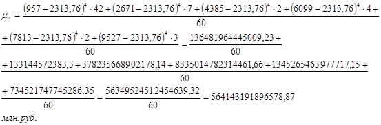 Таково в среднем отклонение вариантов признака от их средней величины. Это отклонение по сравнению со средней величиной признака очень большое. Оно отличается от средней на 419,95 млн.руб. Это свидетельствует о том, что данная совокупность в отношении нашего признака неоднородна, а средняя - -нетипична. Определим среднее линейное отклонение взвешенное для таблицы 3.4:
