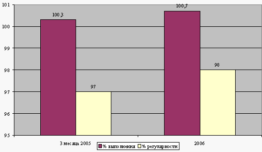 Проценты выполнения рейсов и регулярности движения на городских автобусных маршрутах, обслуживаемых РДАУП "Автобусный парк №1" г. Гомеля за 3 месяца 2005 года и 2006 год приведены на рисунке 1.3.