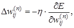 где w - коэффициент синаптической связи, η - коэффициент скорости обучения сети, Е - функция суммарной ошибки сети.