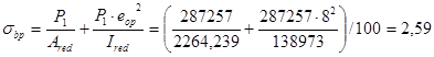 Устанавливаем величину передаточной прочности бетона из условия: Rbp=3.09/0,75=4.12<0.5×B25=12,5 МПа Принимаем Rbp=12,5МПа. Тогда отношение bp/Rbp=3.09/12,5=0,2472. Вычисляем сжимающее напряжение в бетоне на уровне центра тяжести напрягаемой арматуры от усилия обжатия Р1 (без учета изгибающего момента от веса плиты):