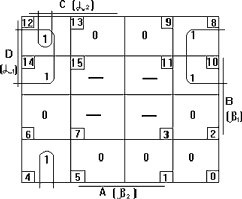 Полученные выражения (3.11-3.13) имеют вполне конкретное логическое толкование и при наличии определенных навыков могли быть получены без составления таблицы истинности и минимизации ПФ. Так, если F3 =1 , а в противном случае F1 и F2 безразличны, то запрос от ВУ1 в виде комбинации F1 =0, F2 =1 поступит лишь тогда, когда α1=1. Значение α2 безразлично, так как даже при α1=α2=1 все равно α1 имеет более высокий приоритет. Если α1=0, а F3 =1, то это значит, что требование прерывания вызвано запросом от ВУ2 (α2=1). При записи выражения (3.11) можно было руководствоваться следующими соображениями. F3 =1 в двух случаях. Во-первых, если поступил запрос от ВУ1 (α1=1) и при этом МП-система ожидает запроса либо обслуживает прерывание от ВУ2 (в обоих случаях β2=0, см. таблицу 3.8). Во вторых, если поступил запрос от ВУ2 (α2=1) и при этом МП-сиcтема находится в состоянии ожидания (β1=β2=0). Сказанное соответствует двум составляющим выражения (3.11). На втором примере мы прошли 2 этапа синтеза комбинационных цифровых электронных устройств: 1. Представление переключательных функций в форме, которая является исходной для выбранного метода минимизации - в нашем случае в виде таблицы истинности и диаграммы Вейча. 2. Получение минимальной ДНФ для каждого выхода комбинационной схемы. 3.12.2.2 Минимизация ПФ с помощью карт Карно На рисунке 3.5 показан пример карты Карно для ПФ четырех переменных (n=4).