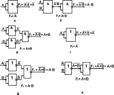Другие примеры использования диаграмм Вейча и карт Карно показаны в [3, 18]. 4 .ЛОГИЧЕСКИЕ ЭЛЕМЕНТЫДля аппаратной реализации булевых выражений используется некоторый набор логических элементов, выпускаемых в виде интегральных микросхем (ИМС). Существуют специализированные ИМС, разработанные методами интегральной технологии специально для получения требуемой логической зависимости. Специализированные ИМС не требуют никаких паяных межсоединений и обладают высокой надежностью. Однако разработка подобных микросхем экономически оправдана лишь при большом объеме выпуска. Примером может служить массовый выпуск специализированных БИС для электронных часов, микрокалькуляторов и т.д. Помимо специализированных ИМС имеется универсальный набор логических элементов в виде ИМС, обеспечивающий реализацию любых логических функций. К этому набору можно отнести: инвертор; конъюнктор; дизъюнктор; повторитель; И-НЕ; ИЛИ-НЕ; исключающее ИЛИ; сложение по модулю два (нечетность); сложение по модулю два с отрицанием (четность); эквивалентность; неэквивалентность; И-ИЛИ-НЕ; запрет и др. 4.1 Инвертор (логический элемент НЕ) Инвертор реализует логическую функцию