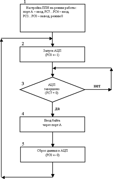 1,3,5 – реальные характеристики всего фильтра, 1-го и 2-го звеньев 2,4,6 – теоретические характеристики всего фильтра, 1-го и 2-го звеньев Рисунок 10.56 10.7 Разработка схемы алгоритма и управляющей программы Неотъемлемой частью любой микропроцессорной системы является управляющая программа, которая обеспечивает выполнение системой заданных функций. На рисунке 10.57 приведена схема алгоритма работы ЛМПСУ, структура которой показана на рисунке 10.1. В начале производится начальная инициализация ведомой ОМЭВМ, включающая начальные установки, программирование таймеров, последовательного и параллельного портов, системы прерываний. Затем обрабатывается первый (индекс 0) канал трехканальной системы сбора, обработки информации и управления. Это происходит в том случае, если отсутствует прерывание от установки флага RI=1 ведомой ОМЭВМ (входной буфер приемника последовательного канала полон). RI=0 отражает отсутствие необходимости удаленного управления, которое заключается в получении ведомой ОМЭВМ команды от микро ЭВМ более высокой ступени иерархии. Значение контролируемого параметра 1-го канала (в нашем случае – расход газа) через аналоговый мультиплексор и устройство выборки-хранения, встроенные в микросхему MAX154, поступит на вход АЦП этой микросхемы. Затем формируется сигнал запуска АЦП, ожидается окончание преобразования и после его завершения информация о текущем значении контролируемого параметра вводится в ОМЭВМ. Здесь это значение сравнивается с заданным, в результате чего вырабатывается сигнал рассогласования, который поступает на цифровой ПИД-регулятор, реализованный программно, и предназначенный для обеспечения требуемого качества процесса управления. С выхода регулятора снимается управляющее воздействие, которое через параллельный порт ОМЭВМ выводится сигналом Цифровое значение, сохраненное в регистре, непосредственно цифро-аналоговым преобразователем, выполненном на матрице R-2R и операционном усилителе, преобразуется в аналоговую величину – напряжение, которая выдается на соответствующий исполнительный элемент. После завершения обработки первого канала формируется сигнал сброса для АЦП и аналогично обрабатываются второй канал – измерения давления, а затем третий – измерения температуры. Если после этого работа системы не завершена, то управление вновь передается обработке 1-го канала и т.д. Если перед очередным циклом обработки появляется сигнал необходимости удаленного управления, то основная программа прерывается и управление передается подпрограмме, осуществляющей взаимодействие с микро ЭВМ более высокого уровня. Рабочая управляющая программа, реализующая данный алгоритм на языке Ассемблер ОМЭВМ МК51 приведена в таблице 10.7.