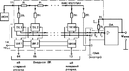 Рисунок 10.32 При поступлении в одном из разрядов входного ДК логической единицы усилитель-инвертор формирует управляющие сигналы, под действием которых транзисторный ключ соединяет резистор 2R с правым нижним выходом ключа. Если подается логический нуль, то резистор 2R соединяется с левым нижним выходом ключа. Для работы с выходом по напряжению к ИС ЦАП К572 ПА1 подключается операционный усилитель, осуществляющий преобразование суммы токов на входе в выходное напряжение (инвертирующее включение ОУ ). Основные параметры ЦАП: – время установления выходного тока: £ 5мкс; – напряжения: Uип = +5...+17В, Uоп = -17...+17В; – входное напряжение логического нуля: (0£Uвх£+0,8В); – входное напряжение логической единицы: (+4,5£Uвх£Uип). Основная схема включения ЦАП показана на рисунке10.33.