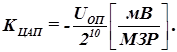 Коэффициент передачи (величина шага квантования по уровню), т.е. расчетное приращение выходного напряжения при изменении входного кода на единицу младшего разряда (цена младшего значащего разряда (МЗР)) составляет: