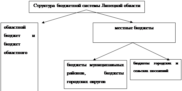 Рисунок 3– Структура бюджетной системы области К стадиям бюджетного процесса в Липецкой области относятся: составление проектов бюджетов; рассмотрение, утверждение бюджетов; исполнение бюджетов; составление, внешняя проверка, рассмотрение и утверждение бюджетной отчетности; государственный финансовый контроль. [2]