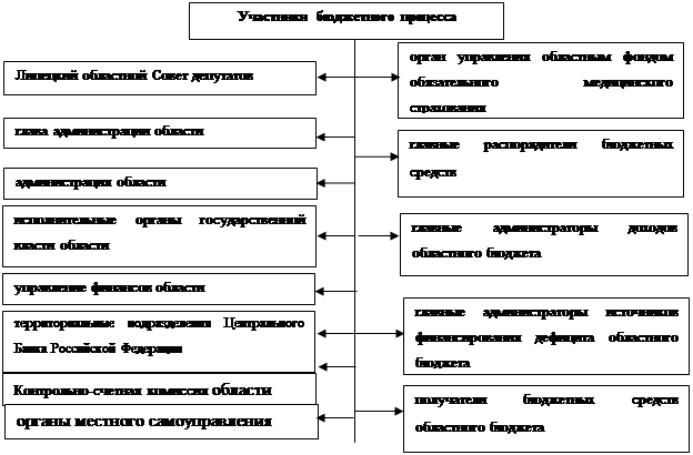 Рисунок 5 – Участники бюджетного процесса Полномочия участников бюджетного процесса заключаются в следующем: – Областной Совет депутатов: устанавливает порядок рассмотрения проектов областного бюджета и бюджета областного фонда обязательного медицинского страхования; определяет порядок представления, рассмотрения и утверждения годового отчета об исполнении областного бюджета; рассматривает проекты законов об областном бюджете и о бюджете областного фонда обязательного медицинского страхования, об исполнении областного бюджета и бюджета областного фонда обязательного медицинского страхования, других законов, регулирующих бюджетные правоотношения на территории области; вводит региональные налоги и сборы, устанавливает налоговые ставки по ним и предоставляет налоговые льготы в соответствии с законодательством Российской Федерации; устанавливает нормативы отчислений доходов в местные бюджеты от федеральных налогов и сборов, в том числе от налогов, предусмотренных специальными налоговыми режимами, и (или) региональных налогов, подлежащих зачислению в соответствии с Бюджетным кодексом Российской Федерации и законодательством о налогах и сборах в областной бюджет; формирует и определяет правовой статус органов, осуществляющих контроль за исполнением областного бюджета; осуществляет государственный финансовый контроль. [2] – Глава администрации области: представляет в областной Совет депутатов проекты законов об областном бюджете, о бюджете областного фонда обязательного медицинского страхования, о внесении изменений в указанные выше законы, об исполнении областного бюджета, бюджета областного фонда обязательного медицинского страхования, проекты других законов, регулирующих бюджетные правоотношения на территории области; назначает представителей от администрации области в согласительную комиссию для рассмотрения разногласий по проекту областного бюджета; определяет представителя в областном Совете депутатов по проектам законов, указанных в абзаце втором настоящей статьи; осуществляет иные полномочия, предусмотренные Бюджетным кодексом Российской Федерации, федеральными законами, иными нормативными правовыми актами Российской Федерации, Уставом Липецкой области и настоящим Законом. [2] – Администрация области: организует работу исполнительных органов государственной власти области и определяет порядок их взаимодействия в процессе составления и исполнения областного бюджета; разрабатывает для представления главой администрации области в областной Совет депутатов проект областного бюджета на очередной финансовый год и плановый период, а также проект программы социально-экономического развития области; устанавливает порядок разработки прогноза социально-экономического развития области; одобряет прогноз социально-экономического развития области; обеспечивает исполнение областного бюджета и готовит отчет об исполнении областного бюджета и отчет о выполнении программы социально-экономического развития области для представления их главой администрации области на утверждение областного Совета депутатов; утверждает долгосрочные областные целевые программы; принимает решения о расходовании средств резервного фонда администрации области, образуемого в составе областног