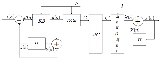 Таким образом квантованный входной сигнал отличается от исходного входного сигнала на величину шума квантования разностного сигнала. Если предсказатель (П) хороший, то дисперсия разностного сигнала будет меньше дисперсии входного сигнала и квантователь с заданным количеством уровней даст меньшую погрешность при квантовании разности, чем при квантовании исходного сигнала. Отношение сигнал – шум квантования в этом случае имеет вид: