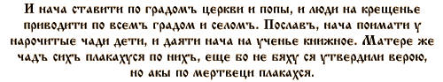 («И начал ставить по городам церкви и определять в них попов и приводить людей на крещение по всем городам и селам. Посылав, он начал собирать у знатных людей детей и отдавать их в обучение книжное. Матери же детей этих плакали о них, ибо еще не утвердились в вере, но плакали о них как по мертвецам».) Первоначально «учение книжное» охватило высшую прослойку древнерусского общества и должно было подготовить детей аристократии к государственной службе. При Владимире также велось обучение представителей низших слоев для приготовления их в священники, как это делалось впоследствии при его сыне — великом князе Киевском Ярославе Мудром. В «Софийской первой летописи старшего извода» сообщается под 1030 годом, что Ярослав, посетив Новгород, приказал собрать С принятием христианства в его византийской форме Древняя Русь оказалась преемницей и хранительницей книжного наследия, созданного со времени Кирилла и Мефодия на старославянском языке в других странах, и в первую очередь в Великой Моравии и Болгарии. От них Древняя Русь унаследовала огромный корпус переводных (главным образом с греческого) и оригинальных древнеславянских памятников: библейские книги (Священное Писание – книги Ветхого и Нового завета), богослужебную и святоотеческую литературу, переводы аскетических произведений, морально-этические произведения, агиографическую литературу (жития святых), юридические сочинения и многое другое. Этот корпус памятников, общий для всего византийско-славянского православного мира, обеспечивал внутри него сознание языкового, культурного и религиозного единства на протяжении многих столетий, вплоть до начала Нового времени. Особенность восприятия византийской книжной культуры заключается в том, что на Руси (как и во всем православном славянстве) была усвоена по преимуществу культура церковная, монастырская, а светская культура, продолжающая традиции античной, столь важной для средневековой Западной Европы, не получила распространения. Из Восточной Болгарии на Русь шли кириллические книги. В столице Первого Болгарского царства Преславе в правление царя Симеона (893—927 годы) учениками Кирилла и Мефодия была создана кириллица с опорой на фонетические достижения глаголицы и с учетом фонематических особенностей восточноболгарского диалекта. Судя по более поздним восточнославянским спискам, в Киеве оказалась дворцовая библиотека из Преслава. К одной из книг, переведенной с греческого для болгарского царя Симеона, восходит роскошно оформленный Изборник, переписанный в Киеве в 1073 году. (Изборник был переписан для великого князя Киевского Изяслава Ярославича, но затем его имя было выскоблено и заменено именем его младшего брата Святослава, захватившего власть в 1073 году.) Каким путем попали на Русь книги из библиотеки болгарских царей? На этот вопрос существуют разные точки зрения. В 971 году при императоре Иоанне Цимисхии византийцы заняли Восточную Болгарию и опустошили Преслав. И.И. Срезневский и А.И. Соболевский полагали, что после разграбления царского дворца в Преславе вместе с его другими сокровищами в Византию была вывезена библиотека болгарских государей, впоследствии отдельные рукописи попали на византийские рынки, а оттуда — на Русь. По мнению М. В. Щепкиной, византийский император Василий II, завершивший завоевани