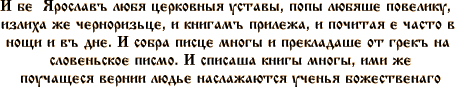 («левый клирос пел по-гречески, а правый — по-русски», точнее по-церковнославянски) В XI веке книги поступали на Русь из столицы Византии Константинополя и, возможно, с Афона — многонациональной монашеской «республики», где уже в X веке болгарский царь Петр основал Ксиропотамский монастырь и где к середине XII века существовали также сербский и русский (Пантелеймонов) монастыри. Основатель Киево-Печерского монастыря Антоний Любечанин (умер в 1072—1073 годах) постригся в монахи на Афоне и некоторое время жил там. Его ученик Феодосий Печерский установил культурные связи с Византией. Постриженник Антония Ефрем жил в одном из монастырей в Константинополе. Между 1062—1074 годом он перевел с греческого монастырский Студийский устав, введенный Феодосием в Киево-Печерском монастыре, а вслед за ним в остальных монастырях Древней Руси. 4.2 Развитие письменной культуры в период Ярослава МудрогоНовый этап в древнерусской книжной культуре связан с именем Ярослава Мудрого. Рассказ о его просветительской деятельности и об учреждении им переводческого центра при храме святой Софии приурочен в «Повести временных лет» к 1037 году, когда в Киеве была основана митрополия: