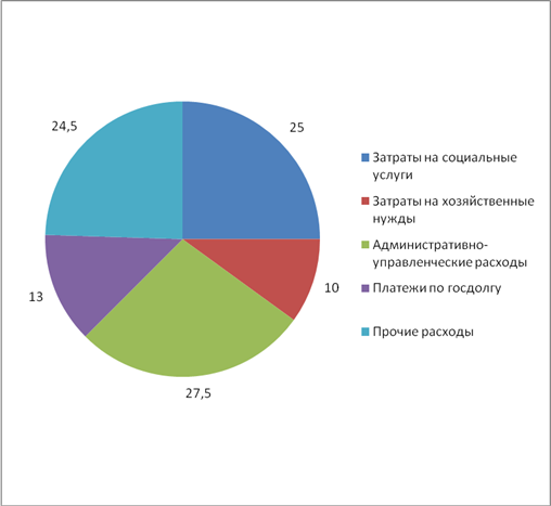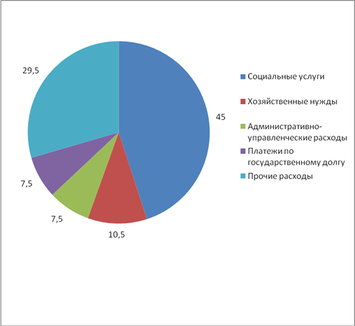 Примерная структура расходов госбюджета Российской Федерации на 2003 год. 1.Затраты на социальные услуги (здравоохранение, образование, социальные пособия) – 25%; 2.Затраты на хозяйственные нужды (дотации госпредприятиям, субсидии сельскому хозяйству, расходы на госпрограммы) – 10%; 3.Административно-управленческие расходы (правительство, полиция, юстиция и т.д.) – 27,5%; 4. Платежи по госдолгу – 13%.