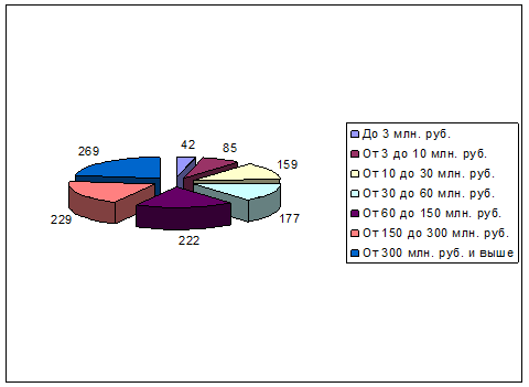 Рис. 1.3.1. Группировка действующих кредитных организаций по величине зарегистрированного уставного капитала в 2007 г. Самая крупная группа российских коммерческих банков - около половины - независимые банки, организованные по инициативе отдельных групп предпринимателей. Здесь вся власть принадлежит правлениям банков, их организаторам. Основную роль в банковской сфере России играет примерно треть коммерческих банков - бывшие специализированные и отраслевые банки со значительным участием государства в акционерных капиталах. Эти банки располагают наибольшим собственным капиталом, активами, количеством филиалов, позволяющих постоянно пополнять собственную кредитную базу, обороты (Приложение 3, 4, рис. 1.3.1, 1.3.2).