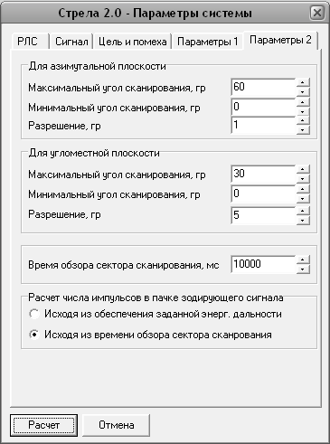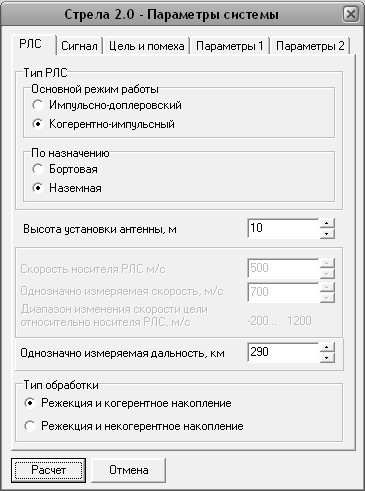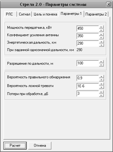 Мощность передатчика: 450 кВт. Коэффициент усиления антенны: 350. Энергетическую дальность равной однозначной дальности и равной 290км. Разрешение по дальности: 100 м, что приемлемо для современных РЛС. Вероятность правильного обнаружения равной 0,9. Вероятность ложной тревоги равной 10-6, эти требования предъявляются современным РЛС. Потери при обработке будут составлять 3 дБ. На пятой закладке «Параметры 2»выбираем: