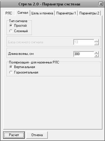 Тип сигнала. Применение сложного сигнала предпочтительней, т. к. при этом увеличивается разрешающая способность по дальности при постоянной разрешающей способности по скорости, а так как в ТЗ не поставлена задача об определении скорости, то дабы не усложнять систему воспользуемся простым сигналом. Длина волны: 3м (для РЛС дальнего обнаружения типичны метровые волны). Тип поляризации — вертикальная. На третьей закладке «Цель и помеха» выбираем:
