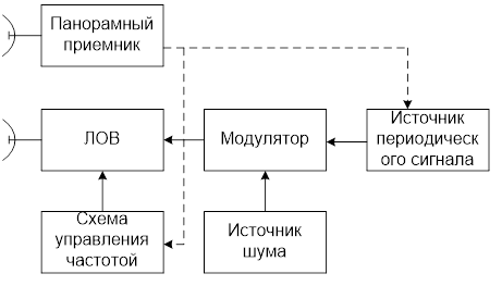 Применение АШП значительно снижает дальность действия РЛС, но при несогласованности параметров подавляемой станции и помехи, эффективность помехи значительно уменьшается, что говорит о необходимости согласования параметров помехи и подавляемой РЛС. Данные о параметрах РЛС, которую надо подавить добываются разведкой или оцениваются в режиме реального времени. Таким образом для эффективного радиоэлектронного подавления необходима обратная связь, то есть измерение параметров подавляемого объекта, фиксации структуры сигнала и режима работы. Для осуществления такого контроля необходимо создавать паузы в работе излучателя помех, что позволяет повысить эффективность средств РЭП за счет большей точности согласования параметров подавляемой станции и параметров АШП. Структурная схема постановщика АШП приведена ниже: