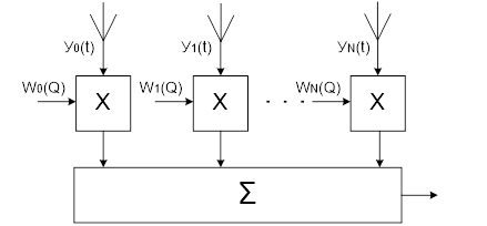 Исходные ДН основной и компенсационной антенн f0(Q), f1(Q). Результирующая ДН антенной системы fΣ(Q)= f0(Q)+Wf1(Q). Если Q1 – угол прихода помехи, то для компенсации необходимо выполнение условия fΣ(Q1)=0, откуда W= - f0(Q1) /f1(Q1). Подставив W в формулу fΣ(Q), получим fΣ(Q)= f0(Q)-[f0(Q1) /f1(Q1)]f1(Q). Таким образом, в направлении на источник помехи образуется провал в ДН антенны. Если помехи действуют с различных направлений, то необходимо применение нескольких компенсирующих антенн. Структурная схема устройства пространственной обработки для подавления нескольких пространственных помех приведена ниже.