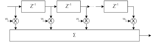 Во временной области возможно применение устройства компенсации помех с корреляционными обратными связями. Основная антенна принимает помеху, а компенсационная антенна принимает помеху от того же источника, отличающуюся по фазе. Используя сигналы этих каналов, можно сформировать компенсатор с корреляционными обратными связями, в котором компенсируется помеха. Такое устройство обеспечивает минимум среднего квадрата напряжения помехи на выходе фильтра. Коэффициенты фильтра должны вычисляться в режиме реального времени, для наиболее эффективного подавления помехи. Структурная схема фильтра приведена ниже.