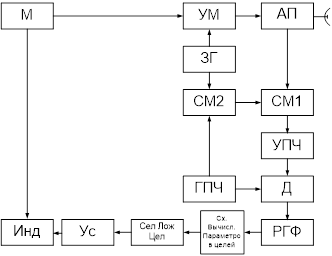 Передатчик построен по многокаскадному принципу. Стабильные колебания задающего генератора усиливаются в усилителе мощности. Одновременно в этом же каскаде происходит импульсная модуляция сигнала. С помощью смесителя СМ2 на который подаются колебания задающего генератора и генератора промежуточной частоты, формируется гетеродинный сигнал, используемый для преобразования частоты принимаемых колебаний в смесителе СМ1. Усиленные в УПЧ сигналы сравниваются с опорным колебанием генератора промежуточной частоты на детекторе. Сигнал биений подается на режекторный фильтр, который осуществляет селекцию сигналов движущихся целей. После этого производится вычисление параметров целей, затем производится селекция ложных целей. После усиления в усилителе сигналы движущихся целей подаются на индикатор. Ниже приведена структурная схема, отображающая взаимодействие конфликтующих сторон.