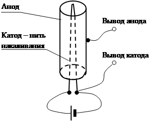 Эффект излучения каких-то частиц или лучей раскаленным электродом, имеющим отрицательный потенциал, был обнаружен всемирно известным изобретателем Т.А.Эдиссоном. Эти лучи назвали катодными и выяснили, что они представляют собой поток отрицательно заряженных частиц – электронов. Коллега Эдиссона Флеминг создал в 1904 году прибор, использующий эффект Эдисона, и назвал его диодом. Диод состоял из раскаленной нити – катода, расположенной внутри металлического цилиндра – анода. Вся эта конструкция помещалась внутрь стеклянного баллона с откачанным воздухом. Принципы работы диода Принцип работы диода был ясен (в отличие от принципа работы полупроводникового диода). Вокруг катода создается электронное облако, плотность которого убывает по мере удаления от него. Если потенциалы катода и анода одинаковы и анод располагается достаточно близко к катоду, то часть электронов попадет на анод, и во внешней цепи (проводнике, соединяющем анод с катодом) будет течь небольшой ток.