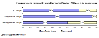 Українські товари становлять понад ¾ від загального товарообігу роздрібної торгівлі. В той же час, їхня частка набагато більша в продажах продовольчих товарів (майже 94%). Тенденції в роздрібній торгівлі продовольчими товарами в Україні: - розвиток великомасштабних форматів та переходом до технології самообслуговування. Створеннямнових форматів роздрібної торгівлі на основі старих продовольчих магазинів / зникнення спеціалізації старих роздрібних точок. - такі формати роздрібної торгівлі, як гіпермаркети та супермаркети швидко здобули популярності замінивши магазини старого типу. Це привело до викупу майже всіх колишніх універмагів, універсамів гастрономів і створення на їх основі нових роздрібних торгівельних точок. - більшість магазинів стали багатопрофільними, торгуючими як продовольчими, та і непродовольчими товарами, вузькоспеціалізовані магазини майже повністю зникли. - використання сучасних торгівельних технологій, в тому числі обладнання для роздрібних торгівельних точок та застосуванням інформаційних технологій у мережах торгівельних закладів. - створення великими роздрібними мережами розподільчих центрів. - поява марок торгівельного підприємства. - розвиток торгівлі в режимі ”он-лайн” та послуг з доставки. Деякі мережі (такі як Фуршет, Мегамаркет, Таврія-В) розробили Інтернет-сторінки з магазинами ”он- лайн”, де споживачі можуть купувати продукцію в режимі реального часу, не виходячи з дому - розвиток роздрібної торгівлі на умовах франчайзингу. - низький рівень іноземних інвестицій в українську роздрібну торгівлю продовольчими товарами. Графік 2.3