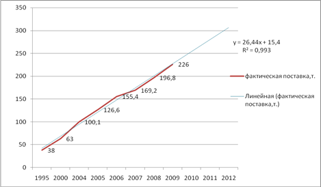 Рисунок 1.3 - Линейный прогноз с использованием линии тренда На рисунках видна величина аппроксимации. Данные свидетельствуют, что ее значение присуще линейному тненду (R2 = 0.9932). Следовательно, для прогнозирования темпа роста объема производства сыра воспользуемся моделью Y = 26,442x +15,4. Прогноз темпа роста объёма производства на десятый период, т.е. на 2011-й год: Y 2011 = 26,442*10+15,4=279,82 тыс. тонн Аналогично рассчитаем прогноз на одиннадцатый период, т.е. на 2012-й год: Y 2012 =26,442*11+15,4= 306,26 тыс. тонн Таким образом, видно, что объём производства постепенно растёт, следовательно, можно предположить рост поставок сыра, как на внутренний рынок, так и на внешний. Таблица 1.2 – Производства сыра на душу населения в Республике Беларусь за 1990, 1995, 2000, 2004-2008 гг.