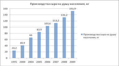 Рисунок 1.4 - Производство сыра на душу населения Как показывают данные рисунка 1.4 производства сыра на душу населения в Республике Беларусь с 1995 по 2009 увеличилось с 24,2кг до 151,9 кг. Увеличение объемов производства сыров составило 6,2 раза или 127,7 кг, за данный период. Рассмотрим удельный вес производства сыра предприятиями Белкоопсоюза в общем объёме по РБ. Таблица 1.3 - Удельный вес производства сыра предприятиями Белкоопсоюза в общем объёме по РБ