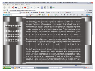 Вот мы перешли на следующую страницу (рис 1.17.) где мы видим фотографию, на которую мы нажали в увеличенном виде. Фотографию можно теперь рассмотреть хорошо и по желанию скопировать себе на компьютер. 13.Эргономическое обоснование Одно из очевидных преимуществ дистанционного обучения состоит в том, что оно позволяет студентам осваивать учебный курс каждому в своем темпе. Обучение с применением современных технологий часто более согласованно и унифицировано, чем традиционное аудиторное обучение. Различные режимы обучения могут использоваться в произвольных комбинациях. К примеру, студенты могут изучать учебник или печатные материалы, обсуждать их с коллегами и задавать вопросы на форуме или по почте, получать видеоролики или графические изображения, сдавать тесты с помощью браузера Web, а затем передавать работы на проверку преподавателю. Еще одно достоинство дистанционного обучения состоит в том, что оно позволяет отказаться от командировок служащих компании на курсы в другой город. Это значит, что компании не придется платить за авиабилеты, гостиницу и питание, не нужно оплачивать работу преподавателей, аренду помещения, учебные и вспомогательные материалы. Конечно, потенциальную экономию расходов при дистанционном обучении необходимо сопоставить с затратами на оборудование и материалы, требующиеся для его реализации. Однако эта альтернатива часто может оказаться намного экономичнее, чем традиционный подход, предусматривающий обучение под руководством преподавателя. Поскольку при дистанционном обучении персоналу не требуется специально ездить в другое место, такое решение помогает также сократить потери рабочего времени сотрудников. В некоторых случаях студенты могут выполнять учебные задания дома, по вечерам, в выходные. Другими словами, они теряют меньше времени в течение рабочей недели. Дистанционное образование - это система учебных программ, разрабо-танных профессионалами, для доступа к которым необходим выход в Интернет. Вы включаете компьютер, открываете сайт вуза или образовательного центра, набираете логин и пароль и приступаете к виртуальным занятиям, а затем по электронной почте получаете домашние задания. Дистанционное обучение сочетает в себе традиции очного и заочного образования. С одной стороны, вы занимаетесь, не отходя от собственного компьютера, самостоятельно осваиваете материал и проверяете знания с помощью виртуальных тестирований, с другой - постоянно находитесь на связи с квалифицированным преподавателем. Современные дистанционные программы нельзя сравнивать с перепечатанными учебниками, представленными в электронном виде, так как необходимо постоянно общаться с преподавателем. В его обязанности входят проверка домашних заданий и консультирование студентов. Допустим, вы самостоятельно ознакомились с правилами согласования времен глаголов в электронном курсе по иностранному языку, прошли тестирование на проверку знаний в режиме on-line... и получили двойку. Преподаватель сразу же свяжется с вами по электронной почте, ICQ или по телефону и объяснит, в чем заключаются основные ошибки, а затем предложит пройти аналогичный тест еще раз. И все - в сжатые сроки. Если на изучение согласования времен глаголов отведен всего месяц, значит, по истечении этого периода вы должны представ