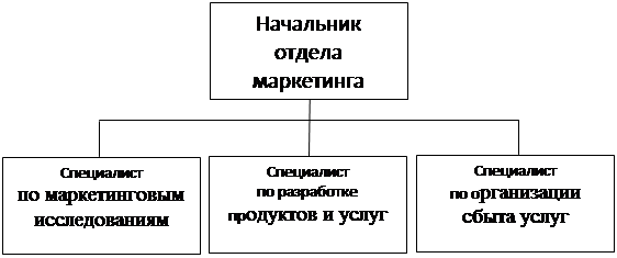 Рис. 1. Схема отдела маркетинга В обязанности службы маркетинга (рис. 1, табл. 1) входит защита средств от инфляции, прогноз получения прибыли, гарантия сохранности и тайна вклада. Практика свидетельствует, что в коммерческом банке наиболее сильной является первая реакция клиента на культуру обслуживания и этот фактор определяет дальнейшее поведение клиента. Поэтому особое внимание следует уделять такому сервисному понятию, как стандарт обслуживания, базирующийся на квалификации персонала и создании благоприятной для клиента окружающей среды в банке. Таблица 1 . Основные функции специалистов отдела маркетинга