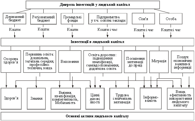 Рис.1.1 Формування основних активів людського капіталу за рахунок інвестицій Розглянемо джерела інвестицій у людський капітал. Вкладення можуть здійснювати держава (уряд), недержавні суспільні фонди й організації, міжнародні фонди й організації, регіони, освітні заклади, підприємства, сім’ї та окремі громадяни. У наш час роль держави у цій галузі дуже велика. Держава застосовує і стимули, і примусові заходи, спрямовані на примноження людського капіталу нації. До примусових належать обов’язкова для всіх формальна шкільна освіта в установленому обсязі, обов’язкові медичні профілактичні заходи (наприклад, щеплення) тощо. Основними є заходи, що стимулюють. Уряд використовує два дійові способи для стимулювання приватних інвестицій у людський капітал, причому цей вплив здійснюється за допомогою економічних ринкових заходів. По-перше, через систему податків і субсидій держава впливає на доходи тих, хто здійснює такі інвестиції. По-друге, уряд може регулювати ціни на інвестиції в людський капітал, регулюючи ціни використовуваних для цього ресурсів. Особливо велика роль держави у двох найважливіших сферах формування людського капіталу - в освіті та охороні здоров’я. Дедалі більше у створенні активів людського капіталу зростає роль окремих підприємств. Часто вони стають найефективнішими виробниками цього капіталу, оскільки здійснюють підготовку персоналу відповідно до поточних і перспективних потреб виробництва, а також мають достовірну інформацію про перспективні напрями капіталовкладень у навчання та професійну підготовку. Однак, підприємствам притаманний прагматичний підхід: вони роблять інвестиції в людський капітал лише доти, доки вони приносять економічну віддачу. Моральні зиски, інтегрований соціальний ефект від цих інвестицій є в основному суспільним благом, у розвитку якого зацікавлена держава, а не конкретне підприємство. Саме тому в цивілізованому світі держава економічними методами заохочує підприємства до інвестування в людський капітал. Інвестуючи у своїх працівників, підприємства активізують їхню трудову віддачу, підвищують продуктивність праці, скорочують витрати робочого часу, зміцнюють свою конкурентоспроможність. Кошти вкладаються в організацію професійної підготовки та підвищення кваліфікації, на профілактичні заходи для зміцнення здоров’я працівників, у цілому - на підвищення якості трудового життя. Науково-технічний прогрес потребує значних витрат, пов’язаних з оновленням знань. Формальна освіта вже давно не єдиний і недостатній метод підготовки людини навіть до трудової діяльності, не кажучи вже про весь комплекс людської життєдіяльності. Отримання диплома і початок трудової діяльності має стати не завершенням процесу освіти, а лише закінченням її загальної, попередньої стадії і початком більш спеціалізованого тривалого процесу набуття професійної кваліфікації, компетентності, загальнолюдської мудрості. Список використаної літератури1. Грішнова О.А. Економіка праці та соціально-трудові відносин: Підручник. - К.: Знання, 2004. - 535 с. 2. Долішній М.І., Злупко С.М. Соціально-трудовий потенціал: теорія і практика. Ч.І. - К.: Наукова думка, 1994. - 263 с. 3. Економіка праці та соціально-трудові відносини: підручник/ А.М. Колот, О.О. Герасименко та ін.; за наук. ред. д-ра екон. Наук, проф. А.М. Колота. - К.
