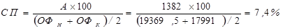 Расчет амортизационных отчислений приведем на 2008 г. Так, в 2007 г. усредненный процент (СП) по амортизационным отчислениям составил 7,4%. Рассчитан он исходя из следующих данных: ОФ на начало года по остаточной стоимости (ОФн ) – 19 369,5 тыс.грн.; ОФ на конец года по остаточной стоимости (ОФк ) – 17 991 тыс.грн.; Амортизационные отчисления (А) – 1 382 тыс.грн.; Фактический средний процент отчислений за 2007 г. равен: