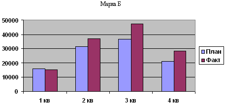 Оценка выполнения плана по ассортименту в ходе производства продукции по кварталам (Марка А и Марка Б)