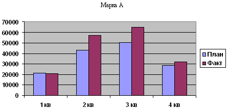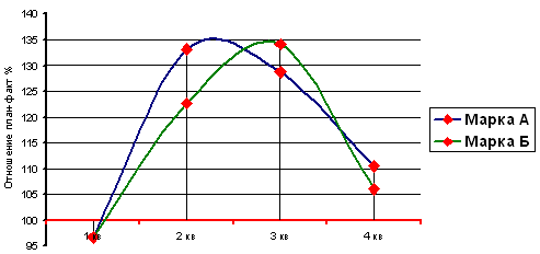 Оценка выполнения плана по ассортименту в ходе реализации продукции по кварталам (Марка А и Марка Б)