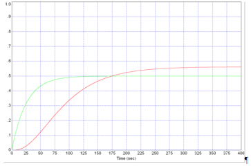 Після розрахунку передаточної функції будуємо криву розгону, якщо розрахунки правильні то два побудованих графіки повинні наложитись: