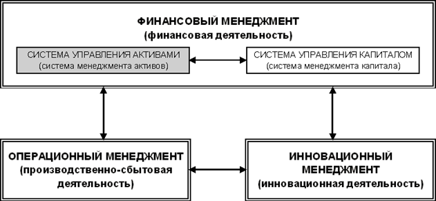 Рис. 1.1. Место системы управления активами в общей иерархической системе управления предприятием Управление активами базируется на ряде принципов, реализация которых обеспечивает его эффективность, а именно: · обеспечение интеграции системы управления активами с общей системой управления предприятием, что должно проявляться в тесной взаимосвязи управления активами с задачами управления финансами, инвестициями, оперативной деятельностью, бухгалтерским учётом; · обеспечение гибкости и многовариантности управления активами, означающее, что при подготовке управленческих решений по формированию и использованию активов в операционном или инвестиционном процессах должны, как правило, разрабатываться альтернативные варианты таких решений в допустимом диапазоне финансовых критериев устанавливаемых предприятием; · обеспечение высокого динамизма управления, означающее, что при разработке и реализации управленческих решений, связанных с активами, необходимо учитывать влияние изменения факторов внешней среды во времени, например, изменения на финансовом или товарном рынках; · обеспечение системного подхода при формировании управленческих решений, означающее, что система управления активами должна рассматриваться как часть общей системы управления, которая обеспечивает разработку взаимозависимых управленческих решений, связанных с формированием и использованием активов в двух других системах (инновационного и производственно-сбытового менеджмента); · ориентация на стратегические цели предприятия, означающая, что эффективность принятия тех или иных управленческих решений в отношении активов должно быть проверенно по критерию соответствия главной цели функционирования — «миссии» предприятия. [5, с.12] Таким образом, управление активами предприятия представляет собой систему принципов и методов разработки и реализации управленческих решений, связанных с формированием, эффективным использованием активов и организацией их оборота в соответствии с главной целью функционирования (миссии) предприятия. Остановимся на вопросах классификации активов. Вообще В экономической теории и хозяйственной практике, связанной с использованием активов, упоминается значительное множество терминов, характеризующих те или иные виды (классы) активов. К числу основных квалификационных признаков можно отнести следующие: - форма существования активов; - характер оборота активов; - характер участия активов в видах деятельности предприятия; - степень ликвидности активов; - источник образования. Классификация видов активов предприятия по предлагаемым классификационным группам приведена в таблице 1.1. Таблица 1.1 Классификация активов предприятия
