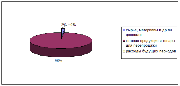 Рис. 2.4. Структура запасов ООО «Крон-Нефто» в 2009 году Как видно из рис.2.4, 98% всех запасов предприятия представляют собой готовая продукция и товары для перепродажи. Вывод. Проведем расчет оборачиваемости оборотных активов по формулам, представленным в табл.2.5 Таблица 2.5 Показатели эффективности использования оборотных активов предприятия