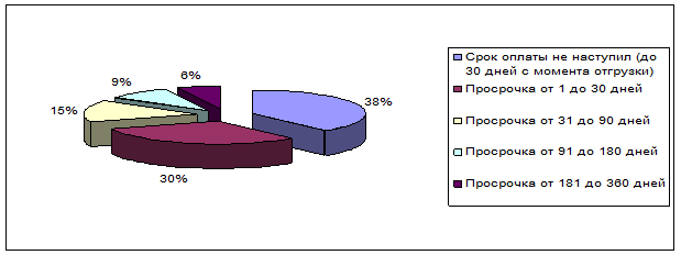 Учитывая рост дебиторской задолженности в течение 2009 года с 265 тыс. руб. до 497 тыс.руб. можно сделать вывод о том, что предприятие проводило 3 тип политики коммерческого кредитования (агрессивная или мягкая политика). Учитывая факт, что согласно политике фирмы в области управления дебиторской задолженностью максимальная отсрочка, предоставляемая покупателям и заказчикам, составляет 30 дней, все счета к получению классифицируются по следующим группам: - Срок оплаты не наступил (до 30 дней с момента отгрузки); - Просрочка от 1 до 30 дней (до 1 месяца); - Просрочка от 31 до 90 дней ( от 1 до 3 месяцев); - Просрочка от 91 до 180 дней (от 3 до 6 месяцев); - Просрочка от 181 до 360 дней (от 6 месяцев до 1 года); - Просрочка от 360 дней и более (более 1 года). [20, с.98] К оправданной относится задолженность, срок погашения которой не наступил или составляет менее одного месяца. К неоправданной относится просроченная задолженность покупателей и заказчиков. Чем длительнее срок просрочки, тем вероятнее неуплата по счету. Отвлечение средств в эту задолженность создает реальную угрозу неплатежеспособности предприятия и ослабляет ликвидность его баланса. В таблице 3.3. представлен анализ состояния расчетов с дебиторами по срокам оплаты счетов покупателями. Таблица 3.3. Анализ состояния дебиторской задолженности