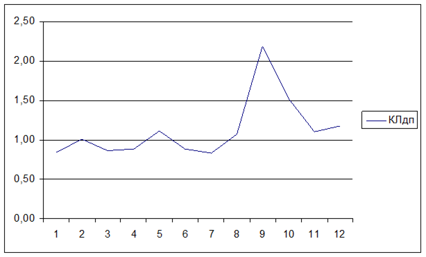 Рис. 3.3. Динамика денежных потоков ООО «Крон-Нефто» Согласно рис. 3.3 положительный денежный поток предприятия не имеет четко выраженной тенденции. Наибольшие поступления денежных средств наблюдались с августа по декабрь. График отрицательного денежного потока также не имеет четко выраженной тенденции. В январе, марте и июне наблюдалось превышение оттока денежных средств над притоком, в декабре отрицательный денежный поток имел свое максимальное значение за весь год. В процессе исследования синхронности формирования различных видов денежных потоков рассчитывается динамика коэффициента ликвидности денежного потока предприятия в разрезе отдельных интервалов рассматриваемого периода. Зачем? Расчет этого показателя осуществляется по следующей формуле: КЛдп = ПДП/ОДП,(3.1) где КЛдп- коэффициент ликвидности денежного потока предприятия в рассматриваемом периоде; ПДП – сумма валового положительного денежного потока(поступления денежных средств); ОДП – сумма валового отрицательного денежного потока(расходования денежных средств). Таблица 3.6 Динамика коэффициента ликвидности денежного потока ООО «Крон-Нефто» по месяцам