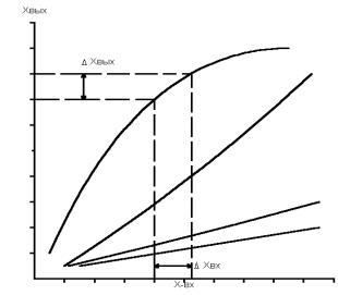 Рис 1. Статические характеристики ОР. Эти характеристики ОР дают возможность оценить степень связи между различными входными и выходными величинами объекта. Статические характеристики определяют расчетным или экспериментальным путем. Динамической характеристикой объекта регулирования называется зависимость выходной величины от входной величины в переходном режиме. Поскольку имения выходной величины ОР при различных возмущениях могут происходить по-разному, для исследования динамических характеристик объекта обычно используют типовые внешние воздействия. Кривая разгона САР температуры (рис.2.) указывает динамические свойства ОР.