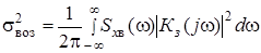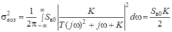 Видим, что при К = 0 дисперсия динамической ошибки равна дисперсии задающего воздействия. Это объясняется тем, что при К = 0 выходной процесс y(t) = 0 и ошибка становится равной задающему воздействию. С увеличением коэффициента передачи К дисперсия уменьшается и стремится к постоянной величине, равной β. На первый взгляд может показаться, что получен результат, противоречащий здравому смыслу. Ведь с увеличением коэффициента передачи разомкнутой системы расширяется полоса пропускания замкнутой системы, значит, должны лучше отрабатываться высокочастотные составляющие задающего воздействия, и ошибка должна стремиться к нулю. Но никакого противоречия нет. Результат объясним, если учесть форму частотной характеристики ошибки. С увеличением К уменьшается запас устойчивости по фазе и, следовательно, увеличивается подъем АЧХ замкнутой системы в области верхних частот. А так как Кош(jω) = 1 – Кз(jω), то уменьшение спектральной плотности задающего воздействия компенсируется увеличением модуля частотной характеристики ошибки. Дисперсия ошибки по возмущению при условии, что возмущающее воздействие является белым шумом со спектральной плотностью Sв0, равна: