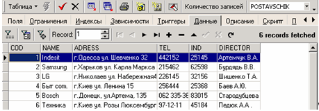 Рис. 3.5 - Вигляд таблиці «постачальники» 3.3 Установка зв'язків між таблицями Вся необхідна робота здійснюється в спеціальному вікні Схема даних, яке відкривається кнопкою на панелі інструментів або командою Сервіс: Схема даних. Для рішення поставленого завдання прийнята схема бази даних, представлена на Мал. 3.6 Для відкриття схеми даних необхідно вибрати команду «Инструменты» в меню «Дизайнер БД». У даній схемі представлений взаємозв'язок всіх таблиць бази даних і відношення між ними.