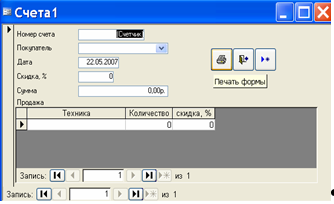 Рис. 4.7 - Зовнішній вигляд форми «Рахунку» 4.2.6 Техніка Дана форма (Рис. 4.8) призначена для введення інформації про техніку: Номер техніки - однозначний ідентифікатор товару до БД, Номера виробника (вводиться за допомогою спливаючого списку), Номера назви (вводиться за допомогою спливаючого списку), моделі, дата випуску, термін гарантії, ціна, номер партії (вводиться за допомогою спливаючого списку), кількість на складі - первинна кількість товару на складі, Зображення товару. На даній формі так само розташовані кнопки додавання запису, виходу з форми і друку даної форми.