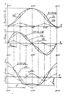 Рис. 2. Зависимости х=f(j), v=f(j) и j=f(j) Так, при повороте коленчатого вала на 90° – половину полоборота (180°) – поршень перемещается от ВМТ к НМТ не на половину полного хода S , а на большую величину В КШМ работающего двигателя со стороны днища поршня действуют переменные силы давления газов рг. С обратной стороны днища – давление газов в картере, близкое по величине к давлению окружающей среды ро. Сила давления газов на днище поршня в текущий момент времени Pг=(рг - ро)Fn, где Fn – площадь поперечного сечения днища поршня. В расчетах часто используется удельная сила (давление). Одновременно с газовыми силами в КШМ действуют силы инерции возвратно-поступательно движущихся и вращающихся масс деталей двигателя. Количественная зависимость рг=f(j) может быть установлена путем перестроения индикаторной диаграммы рг=f(V) известными методами, например, с помощью зависимости Vх =Fn×x=Fnf(j). Функция х=f(j) представлена на рис. 2. Для инженерного упрощенного расчета отмеченных сил инерции производится замена реального КШМ эквивалентной динамической системой сосредоточенных масс (рис. 3.). Полагают: масса поршневого комплекта mn сосредоточена на оси поршневого пальца; масса шатуна mш распределена по двум точкам – на оси поршневого пальца и на оси кривошипа.