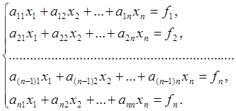 Чтобы данная СЛАУ имела единственное решение, нужно, чтобы определитель матрицы коэффициентов А не был равен нулю (det(A))¹0. Данную систему можно решить многими методами. Например, методом Гаусса. Решение этой системы методом Гаусса потребует выполнить