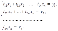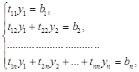 После того, как матрица Т найдена, систему (1.1) заменяем двумя эквивалентными ей системами с треугольными матрицами T¢y = b, Tx = y. (1.4) Обратный ход . Записываем в развернутом виде системы (1.4):